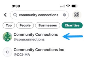 If you are on the VENMO Mobile App, you can search for ‘@comconnections’ and find us under the ‘Charities’ section. There are a lot of other organizations with similar names to ours. Here is a picture of what the results from the search would look like. The blue arrow points to what we look like with our logo showing up.