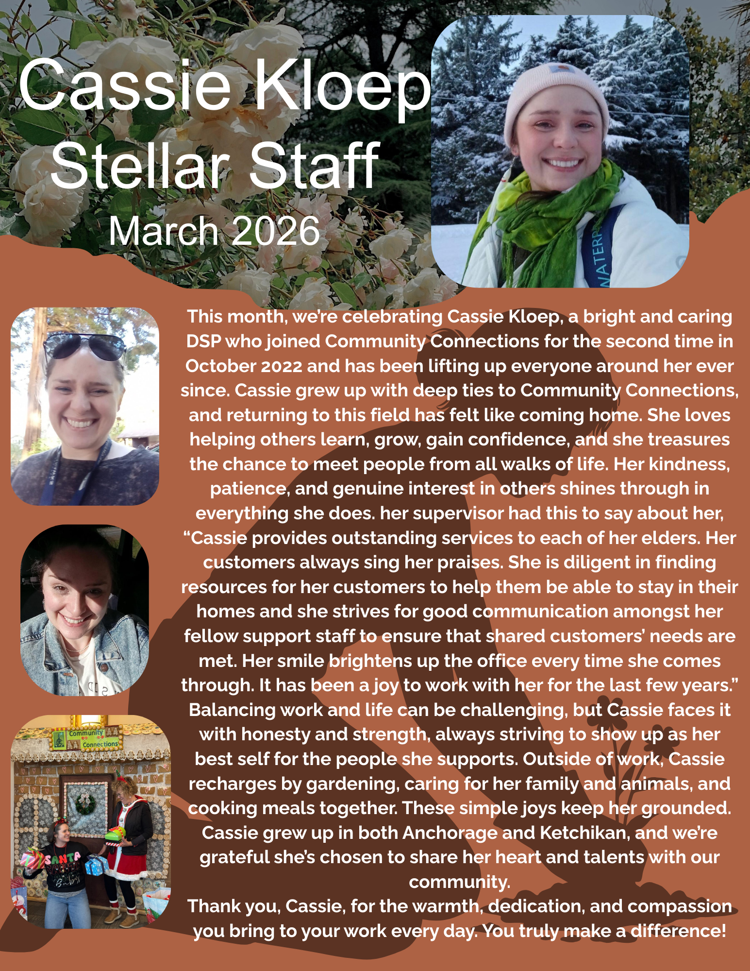 This month, we’re celebrating Cassie Kloep, a bright and caring DSP who joined Community Connections for the second time in October 2022 and has been lifting up everyone around her ever since. Cassie grew up with deep ties to Community Connections, and returning to this field has felt like coming home. She loves helping others learn, grow, gain confidence, and she treasures the chance to meet people from all walks of life. Her kindness, patience, and genuine interest in others shines through in everything she does. her supervisor had this to say about her, “Cassie provides outstanding services to each of her elders. Her customers always sing her praises. She is diligent in finding resources for her customers to help them be able to stay in their homes and she strives for good communication amongst her fellow support staff to ensure that shared customers’ needs are met. Her smile brightens up the office every time she comes through. It has been a joy to work with her for the last few years.”  Balancing work and life can be challenging, but Cassie faces it with honesty and strength, always striving to show up as her best self for the people she supports. Outside of work, Cassie recharges by gardening, caring for her family and animals, and cooking meals together. These simple joys keep her grounded. Cassie grew up in both Anchorage and Ketchikan, and we’re grateful she’s chosen to share her heart and talents with our community.